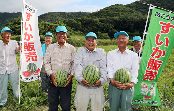「大津スイカ」の豊作に笑顔をみせる「大津年輪の会」のみなさん