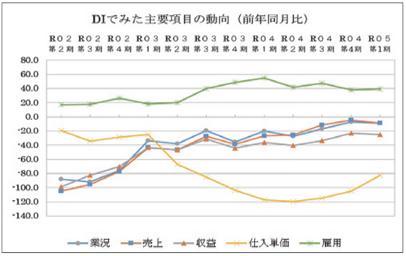 とはいえ、前回調査時の来期見通し(▲15・1)よりも良好な結果。今回調査の来期見通しは▲3・3まで回復するとの数値になっており、引き続き景気回復が進むと予測する事業所が多いことを示している。また、2022年1〜3月期から5期続けてマイナス100を下回っていた仕入単価DI(数値が低いほど仕入単価が高いと感じる事業者が多い)は▲82・6で6期ぶりにマイナス2桁まで改善し、物価高騰への対応が進みつつあるとうかがえる。