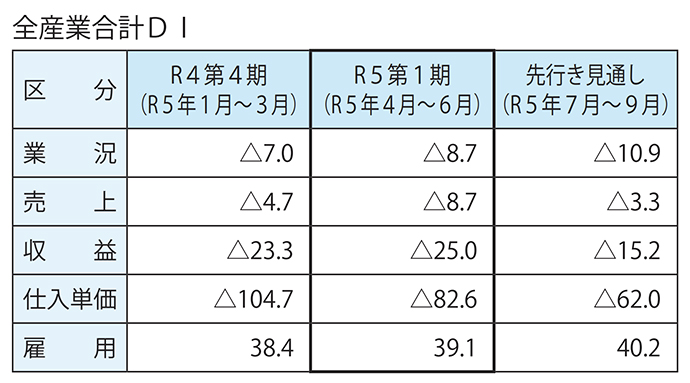 売上DIは、売上が「増加」した事業所から「減少」した事業所を差し引いた指標。今期は▲8・7で、▲4・7だった前期から4・0ポイント下降した。