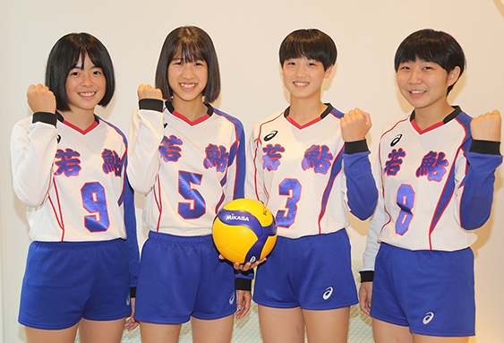 ▽宮地怜奈さん(15)=城西町、赤穂中3年▽米田胡々葉さん(15)=中広、赤穂中3年▽安達萌生さん(14)=尾崎、赤穂東中2年▽苔縄幸伽さん(14)=南野中、赤穂中2年の4人。安達さんはセッターで他の3人はアタッカーだ。