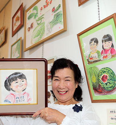 カラオケや手芸など趣味の多い山脇さん。3年ほど前、散歩中に見かけた路傍の花をスケッチブックに描いたのをきっかけに水彩画を始めた。題材にするのは、幼かった頃の孫や愛犬の写真、夫が育てて収穫した野菜など。夫が居間でテレビを見ているそばで絵筆を動かす時間に幸せを感じるという。
