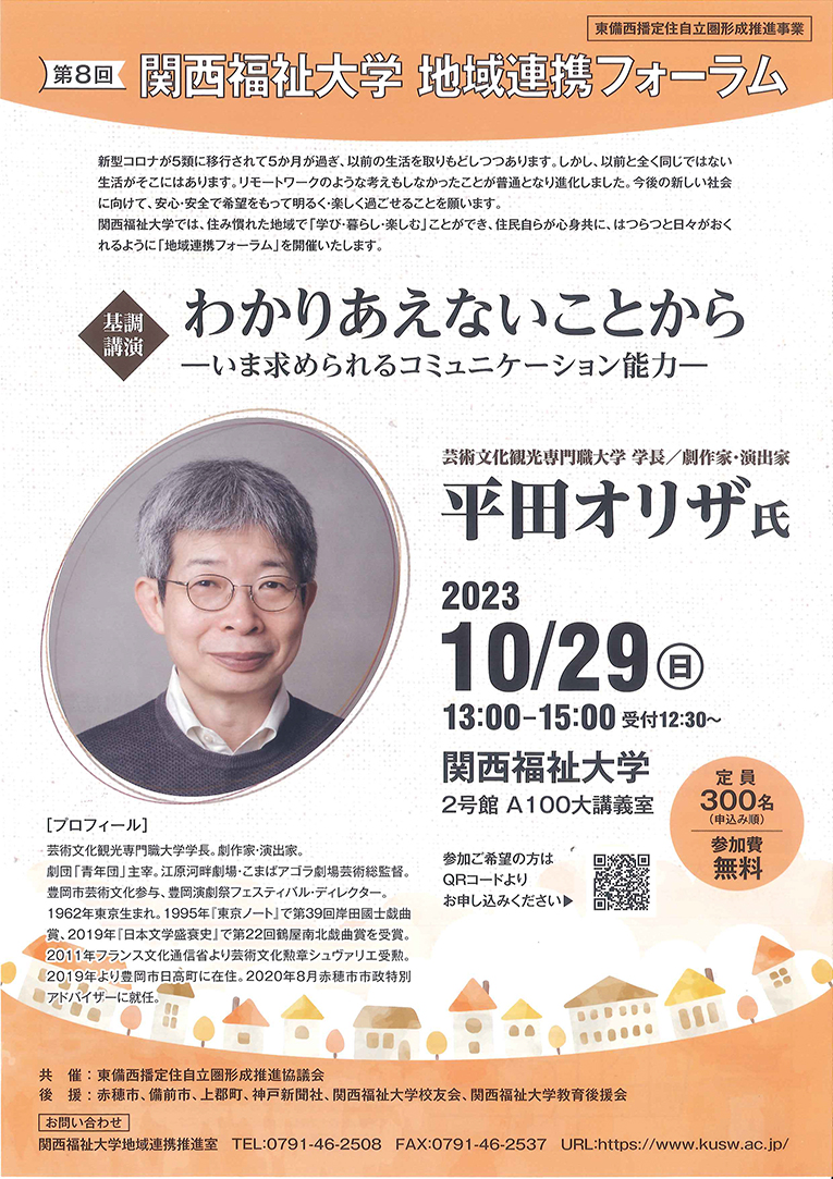 関西福祉大学主催の地域連携フォーラムが10月29日(日)、新田の同大学で開催。赤穂市市政特別アドバイザーで劇作家・演出家の平田オリザ氏(芸術文化観光専門職大学学長)が基調講演する。