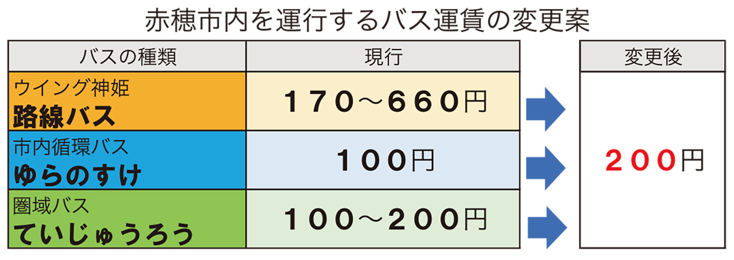 均一料金制が導入されれば、ゆらのすけの運賃は2倍に。路線バスは、運賃200円以内の区間は値上げまたは据え置きとなる一方、200円を超える区間では減額となる。例えば、播州赤穂〜亀の井ホテル赤穂の運賃は現行の370円から200円となる。また、すべてのバスが一定期間乗り放題となる定期券(サブスクリプションサービス)の導入も見込む。