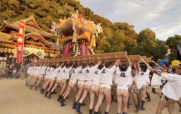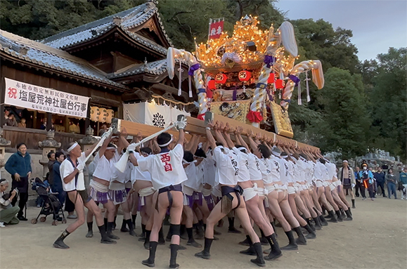 塩屋荒神社の例祭が22日にあり、獅子舞や屋台行事(赤穂市無形民俗文化財)に大勢の見物客が集まった。