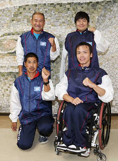 特別全国障害者スポーツ大会「燃ゆる感動かごしま大会」に出場する=前列右から時計回りに=枝川哲也さん、黒川武文さん、大河内健一郎さん、古川修哉さん