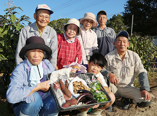 「農地を有効活用した上に、会員同士の交流や生きがいづくりにもなっている。うちの自慢の活動の一つ」と榊会長。農園に関わるまで「プランターでミニトマトを育てたことしかなかった」という根木さんは「野菜づくりは難しいが、会員のみなさんに喜んでもらえることを励みに頑張っています」と汗を流す。