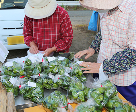 取材した日はちょうど週3回ある収穫日。収穫班の高見幸恵さん(78)と三浦君代さん(84)がピーマンを袋に詰め、会員の名前が印刷されたラベルを貼り付けていた。収穫した野菜は、ほとんどその日のうちに会員宅へ配られる。会員らは旬の野菜が届くのを楽しみにし、特にダイコンのように重量のあるものは「自分で買って持ち帰るのは大変なので助かる」と喜ばれる。