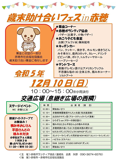 バザーやステージイベントなどを催す「歳末助け合いフェスin赤穂」が12月10日(日)、加里屋の交通広場(兵庫信用金庫赤穂支店向かい)で午前10時〜午後3時に行われる。小雨決行。