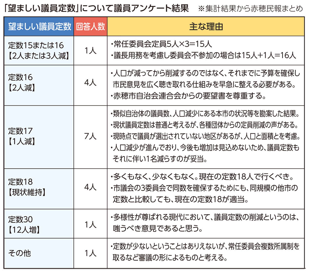 アンケートの回答内容を元に各議員が考える「望ましい議員定数」を分類した結果では、「定数17」との回答が7人で最多。「現状維持」と「定数16」がいずれも4人、「定数15または16」と「定数30」が各1人だった。