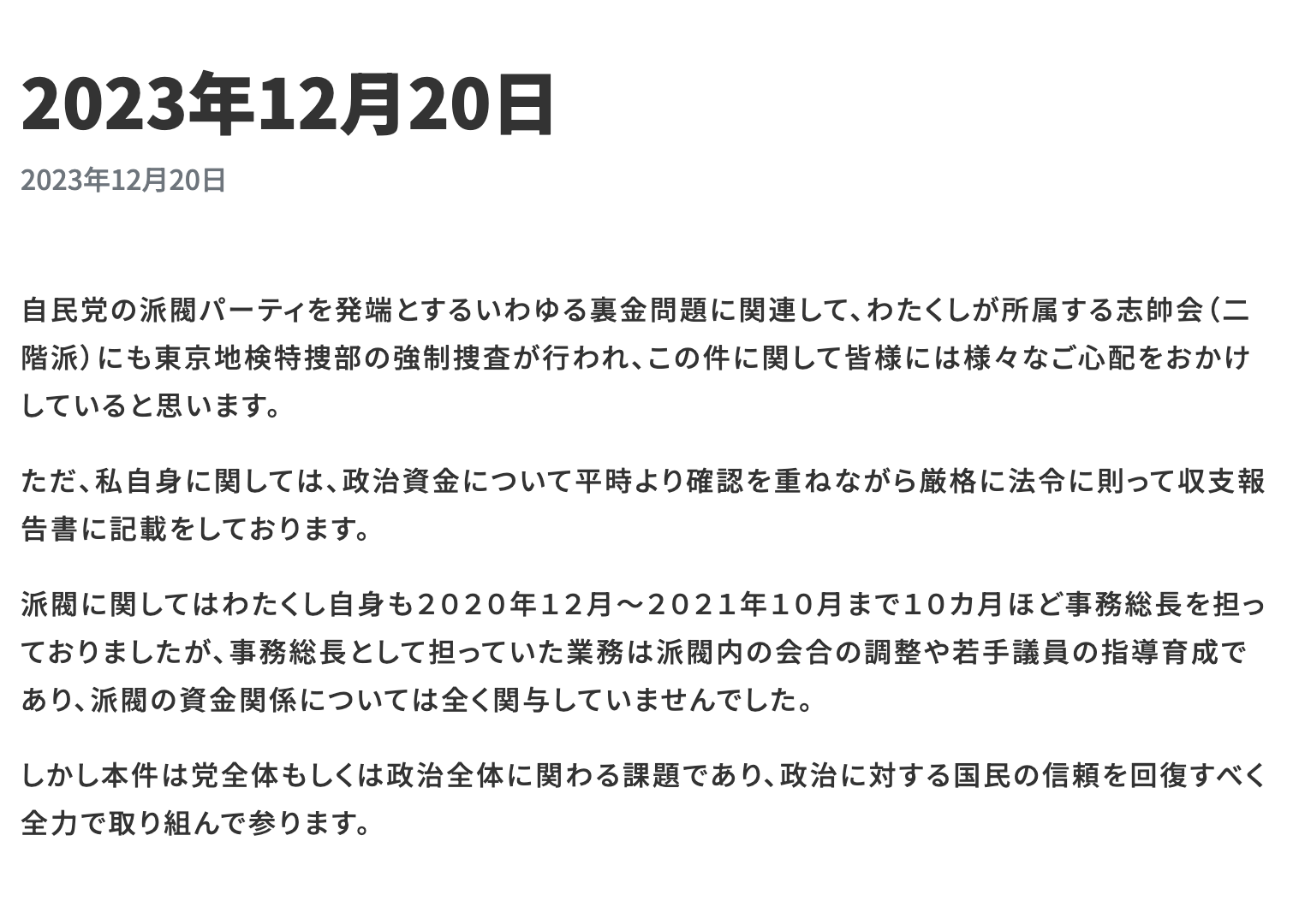 また、自身の政治資金についても「平時より確認を重ねながら厳格に法令に則って収支報告書に記載をしている」と潔白を主張。「本件は党全体もしくは政治全体に関わる課題であり、政治に対する国民の信頼を回復すべく全力で取り組んで参ります」とコメントした。
