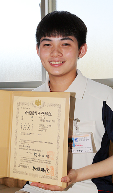 ▼ベトナム人留学生が介護福祉士合格=介護職としての技能を身につけようとベトナムから来日して赤穂市内で暮らすホーチミン出身のグエン・クオン・ファムさん(21)が介護福祉士の国家試験に合格。