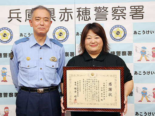 ▼詐欺被害防ぎ感謝状=特殊詐欺被害を未然に防いだとして、赤穂署(堀井昭彦署長)は「ファミリーマート赤穂加里屋中洲店」の引本寿美店長(57)=中広=に署長感謝状を贈った。