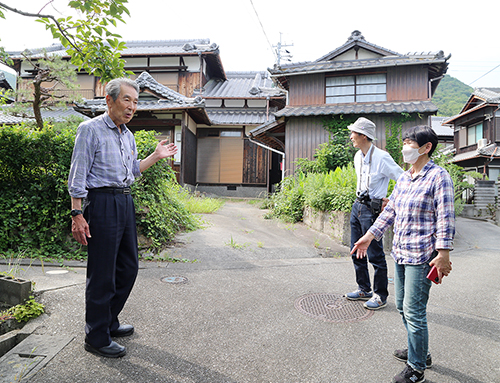 ▼福浦で伊能忠敬の足跡調査=江戸時代に全国各地を実測し、精密な日本地図を作った伊能忠敬の研究グループが福浦地区を調査。伊能隊一行の宿泊地として記録が残る「百姓伊助」宅を探した。