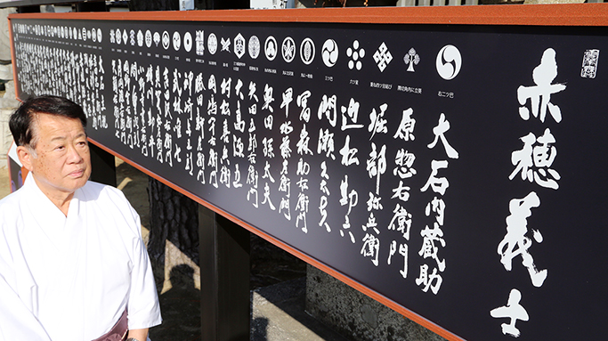 ▼大石神社に四十七士銘板=加里屋の書家、妻井昭二さん(83)=号・柏秀=が赤穂義士四十七士の名を揮毫した銘板を上仮屋の赤穂大石神社に寄贈。