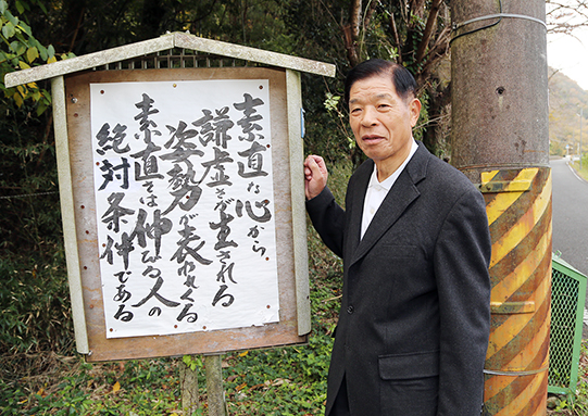 高野の田端(たなばた)地区の市道沿いに人生訓や警句などを月替わりで張り出す掲示板が立っている。こうした掲示板は寺院のそばで見かけることが多いが、この掲示板の近くに寺はない。誰が掲出しているのか。言葉の主に話を聞いた。