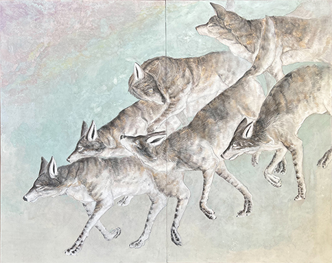 日展会友の清水さんはアララギ派歌人・島木赤彦の短歌「山道に日は暮れゆきて栂の葉に音する雲は過ぎ行きにけり」を調和体で書した。鍛治本さんは中国の五言詩「宇若瀛詩」を篆書体で書し、5度目の挑戦で初めての入選。古川さんは朝方の空を思わせる背景に狼の群れを描いた「空」(F150号)を出品した。