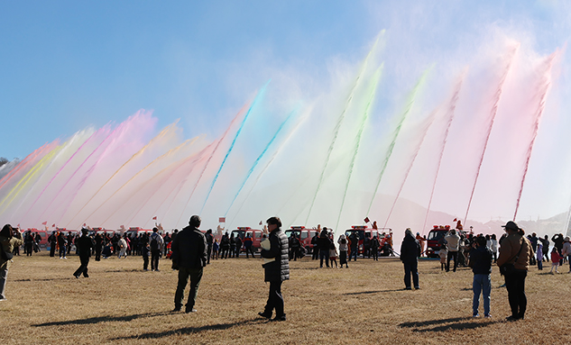消防ポンプ車による一斉放水で防火への決意を示した赤穂市消防出初式