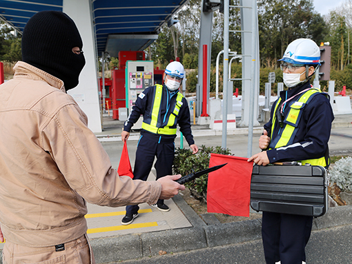 職員2人が料金所の自動収受機から回収した現金を事務室へ運ぶ途中、ナイフを持った男に脅されてかばんを奪い取られる、との想定。赤穂警察署の署員が目出し帽をかぶって犯人役に扮した。被害に遭った職員らは事務所に駆け込んで事件発生を知らせ、逃走車両に向けてカラーボールを投げつけた。別の職員たちは非常通報ボタンを押して110番通報し、犯人が逃げた方向を監視カメラで追跡。駆けつけた捜査員に男の人相や服装などを伝えた。