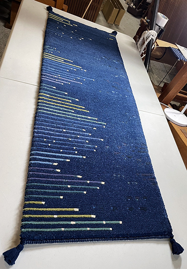 15歳で赤穂緞通織方技法講習会の1期生として入門した見並さんは市選定保存技術保持者だった故阪口キリヱさんに師事。自宅工房で研さんを積み、2020年に念願だった初個展を開いた。伝統的な緞通に加え、これまでにない形状やオリジナル文様の作品づくりにも意欲的。昨年には藤の繊維で織った「藤緞通」の復元にも取り組み、全国伝統的工芸品公募展に2年連続で入選した。