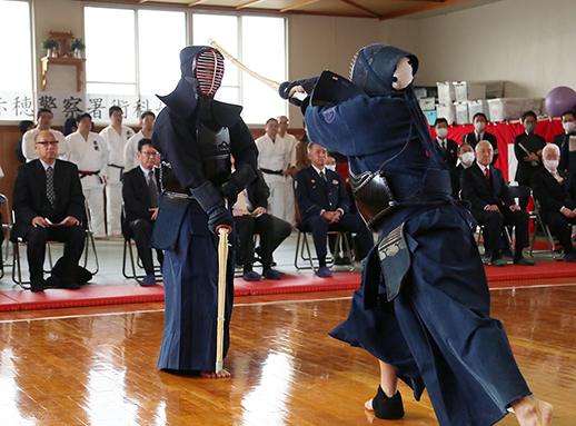 コロナ禍の中止をはさんで5年ぶり。堀井昭彦署長は「能登地震の被災地で活動している警察官の仲間たちに思いをはせながら、日頃の稽古の成果を発揮してほしい」と訓示。署員らは年始早々から寒稽古を積んで臨んだといい、来賓約20人が見つめる中、気合いのこもった計8試合を披露した。