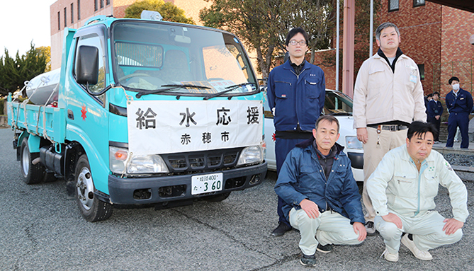 能登半島地震の影響で断水が続く石川県で応急給水活動を行うため、赤穂市は8日、給水車と職員4人を災害派遣した。