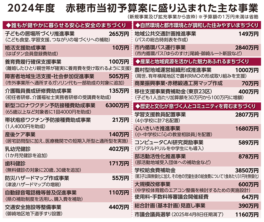 厳しい財政状況の中、赤穂市民病院事業会計に前年度とほぼ同額の14億0502万円(うち3億円は経営健全化分)を繰り出す。市財政課によれば、国の地方交付税算入が見込める分を除き約5億9700万円が市の持ち出しになるという。さらに施設と医療機器の整備に3億6017万円を計上した。一方、牟礼正稔市長が公約に掲げる学校給食費の完全無償化は「恒久財源の見通しが立たない」として今回も見送られ、第3子以降の無償は継続するものの、その他の児童生徒については1食あたりの補助額を22円から31円、総額で3740万円から3850万円に拡充するにとどまった。