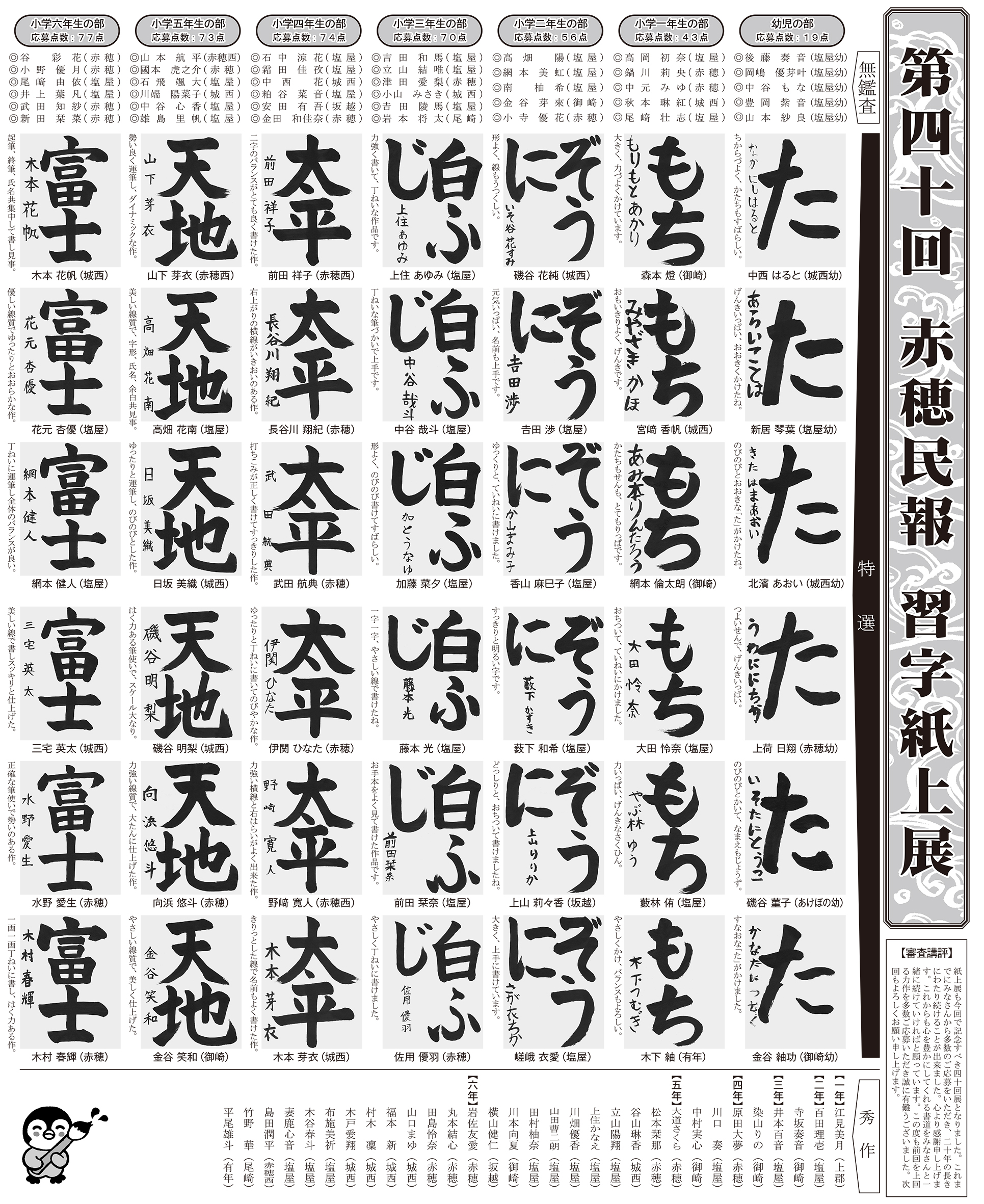 幼児から小学6年までを対象に作品を募集した第40回赤穂民報習字紙上展の入賞者がこのほど決定した。
