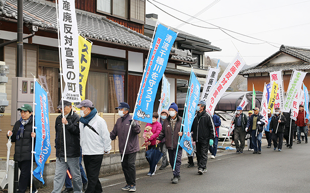 全国名水百選の千種川をはじめ地元の豊かな自然を未来へ残そうと保全に取り組む住民団体「西はりまの自然をまもる会」(小河尚子会長)は18日、千種川水系・梨ヶ原川の源流部の産業廃棄物最終処分場建設計画に反対の意思を表明するデモ行進を有年地区で実施した。
