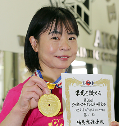 仰向けでバーベルを持ち上げる重量を競う第36回全日本ベンチプレス選手権大会で、パワーハウス赤穂の福島友佳子さん(53)=若草町=が女子47キロ級で通算24度目の優勝。自身の持つ歴代最多優勝回数を更新した。