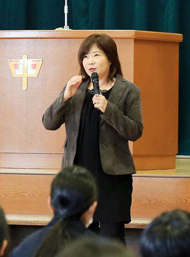 全校生徒と保護者など約300人が聴講。生徒を代表して生徒会長の花田航規君(14)は「新たな視点を持つことができた。一つしかない命を大切に日々頑張っていきたい」と謝辞を述べた。