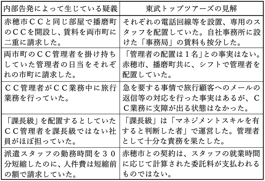 告発者から寄せられた情報や赤穂市の調査によれば、CCの賃料以外にも(1)両市町のCC管理者を1人で掛け持ちしていたのに、管理者の日当をそれぞれの市町に請求していた(2)CC管理者がCCの業務時間内に旅行業の仕事をしていた(3)「課長級」を配置するとしていたCC管理者をグループ会社からの派遣社員がほぼ担っていた(4)CCの派遣スタッフは「午後5時45分」まで勤務することになっていたのに実際は午後5時15分で勤務終了し、0・5時間分多く人件費を請求していた―といった疑義がある。
