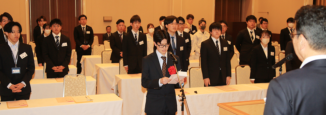 主催者代表であいさつした目木敏彦会頭をはじめ、来賓が歓迎と激励のスピーチ。新入社員を代表して赤穂化成の須貝元気さん(22)=さつき町=が「早く仕事に慣れ、一社会人として地域社会に貢献したい」などと「誓いのことば」を述べた。
