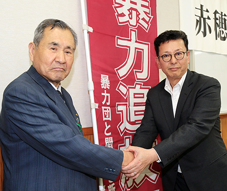 今後は会長の任期を1年とし、各分会の持ち回りで選任することを申し合わせた。長年にわたり先頭に立って活動をリードしてきた藤野氏は「継続は力なり。新会長の下、結束してさらに組織を充実させ、赤穂の安全を守ってほしい」とあいさつ。バトンを受け取った新会長の目木氏は「私たちが平和に安全に経済活動ができるのも、藤野会長はじめ先輩方が活動を続けてこられたおかげ。7つの分会が力を合わせ、この旗を守り続けていく」と決意を述べた。