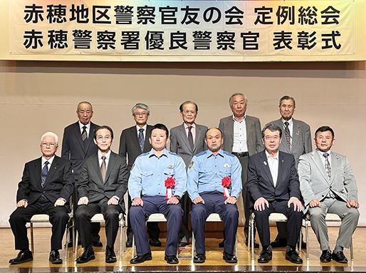 赤穂地区警察官友の会の優良警察官表彰を受けた山本智之巡査部長=前列右から3人目=と池部良巡査部長=同4人目