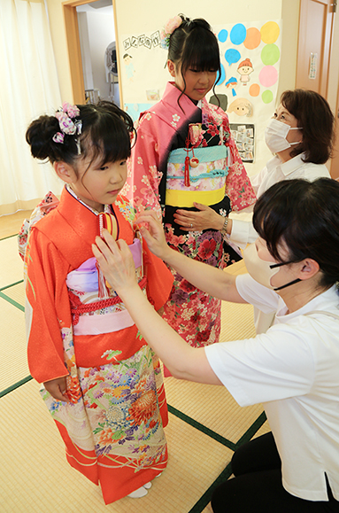 この日は入所者36人中17人が体験。後日、残りの希望者を対象に実施する。山本さんは5年ほど前から施設でたこ焼きを焼いて振る舞うプレゼントを続けており、子どもたちから「たこ焼きのおっちゃん」と親しみを込めて呼ばれている。中河篤司施設長は「普段和装する機会がないので、とても良い思い出になると思う。山本さんに感謝したい」と話した。