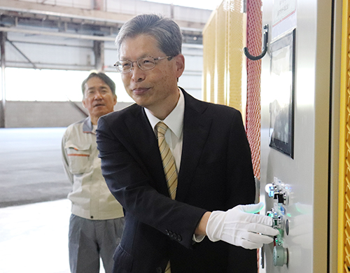 新プラントの竣工式で稼働ボタンを押す小形昌徳・常務執行役員=同社提供