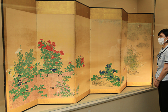 義信の『秋草鶉蝶図屏風』はススキやナデシコなどの草花とウズラ、蝶を描いた六曲一隻。金銀砂子を配した豪華な仕上がりが目を引く。文信の『旭昇七福神宝船図』は朝日が昇る海と七福神が乗る宝船を描いた縁起の良い作品。林の『街角』はパリのサクレ・クール寺院が見える風景をモチーフ。黄谷の片口鉢は3種類の釉薬を掛け分け、自身が創出した雲火焼にとどまらない多彩な技術がうかがえる。