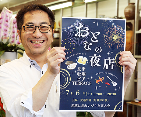 初めて開催する「おとなの夜店」をPRする「赤穂にぎわいづくり商人会」の田辺尚也会長