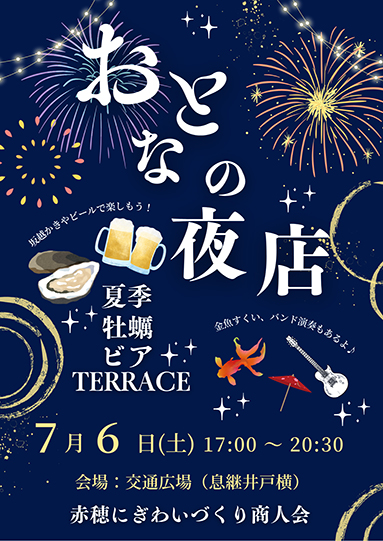 今季最後の「土曜夜店」がある7月6日、加里屋の息継ぎ井戸横「交通広場」で「おとなの夜店〜夏季牡蠣ビアテラス」が同日開催される。
