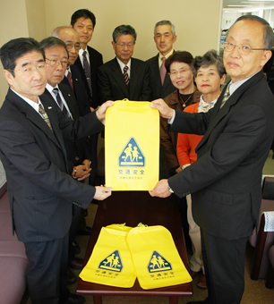 市内小学校の新1年生児童分に相当する約540枚を寄贈した。遠くからでも見えやすい黄色のビニール製。各校の入学式で児童に配布される。