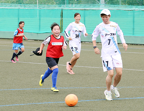 参加した子どもたちの約2割は女子で、塩屋サッカー少年団の小学5年、手向悠月(てむかい・ゆづき)さんは「お姉さんたちは動きが速いだけでなくて周りをよく見ていた。自分ももっとサッカーがうまくなりたい」と憧れた。アルビオンの小島美玖キャプテン(27)は「たくさんボールで遊んで、サッカーを好きになって」とエールを送った。