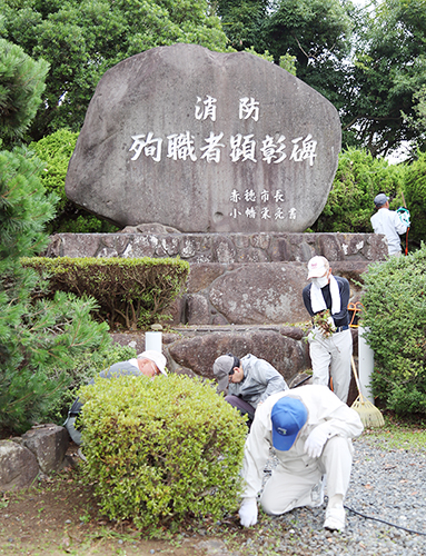 赤穂市内では1949年と70年に発生した山火事で消防団員計4人が殉職。顕彰碑の清掃活動は建立翌年の72年から市消防団OB組織「緋ぐるま会」が行っている。この日は会員をはじめ現役団員や消防本部職員も参加。石碑周辺の雑草を取り除き、植え込みをきれいに苅り揃えた。