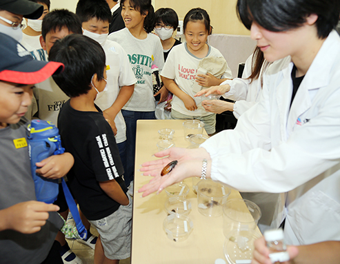 高齢者大学赤穂西校と福浦校の合同講座で、赤穂西小学校の5・6年生児童24人も参加した。坂越のアース製薬研究所に25年間勤め、『きらいになれない害虫図鑑』の著書がある有吉立(りつ)さんと、入社4年目の奥澤菜弥さんを講師に招いた。