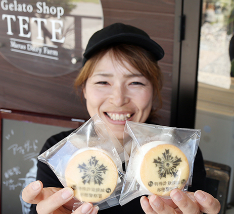 クッキーではさんだアイスは定番の「ミルク」と、赤穂塩を隠し味に配合した「塩」の2種類があり、色や形はまったく同じ。旭日章に重ねられた「みるく」「しお」の隠し文字を確認してようやく見分けがつく。