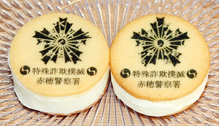 第3弾となる今回は、中広の「ジェラートショップTETE」の協力で、同店の人気商品「クッキーサンド」の表面に警察紋章の旭日章とともに「特殊詐欺撲滅」の文字をプリントした。