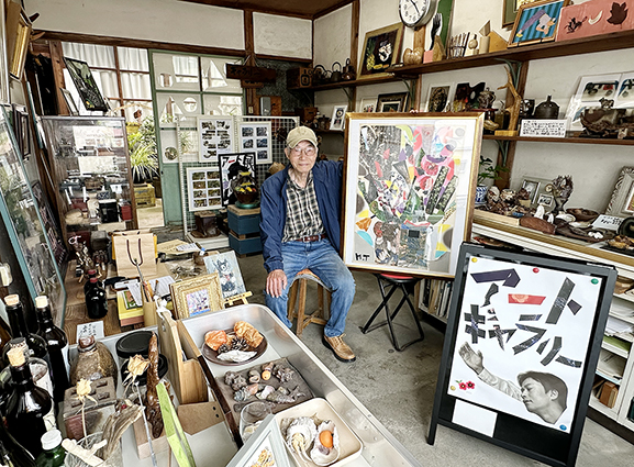 前赤穂美術協会長の鳥井廣夫さん(89)=坂越=が大避神社の参道入り口横にある古民家にアートギャラリーを開設した。油絵や陶芸、オブジェなど自身の作品を所狭しと並べている。