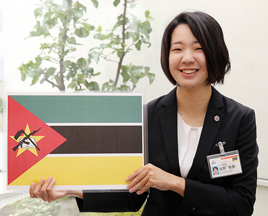 モザンビークの国旗を手に青年海外協力隊員としての抱負を語る安則栄美さん