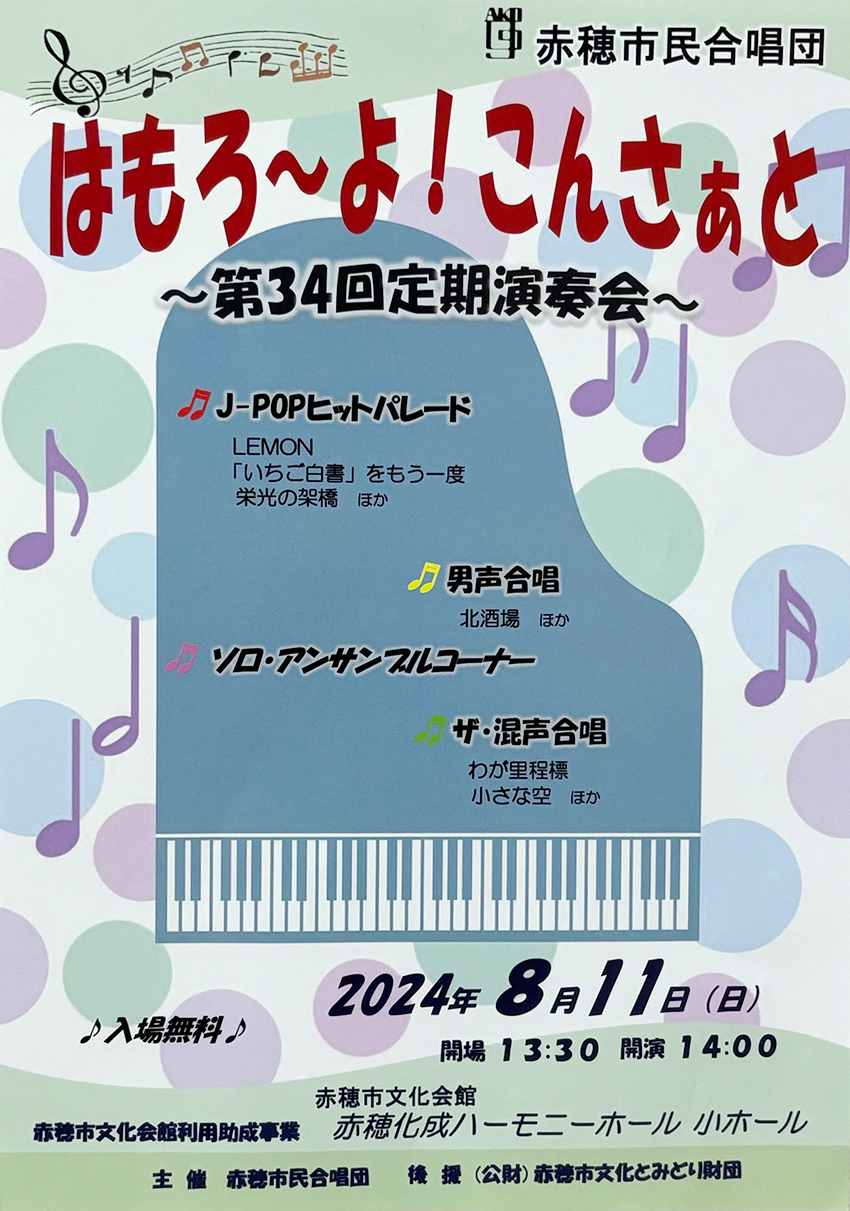 赤穂市民合唱団の第34回定期演奏会「はもろ〜よ!こんさぁと」が8月11日(日)、中広の赤穂化成ハーモニーホールで開催される。