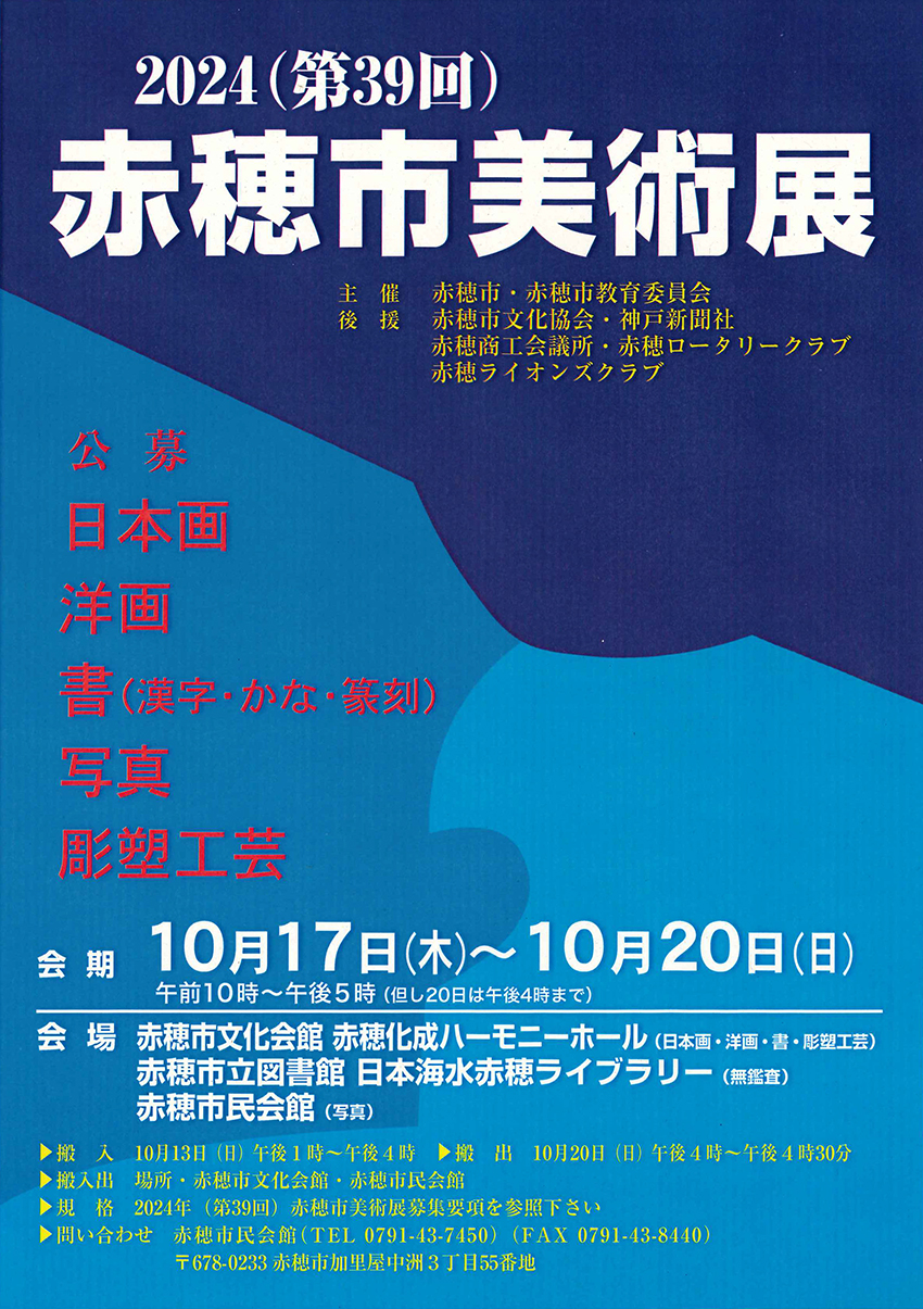 第39回赤穂市美術展(10月17日〜20日、赤穂化成ハーモニーホールなど)の作品募集要項がこのほど発表された。
