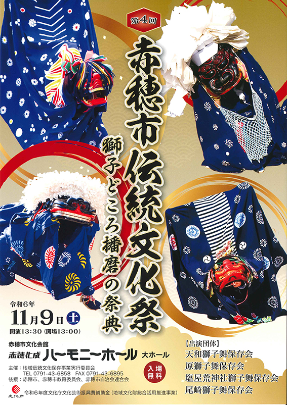 赤穂市内各地域で獅子舞を伝承する団体が日頃の練習成果を披露する第4回赤穂市伝統文化祭が11月9日(土)、中広の赤穂化成ハーモニーホールで開催される。